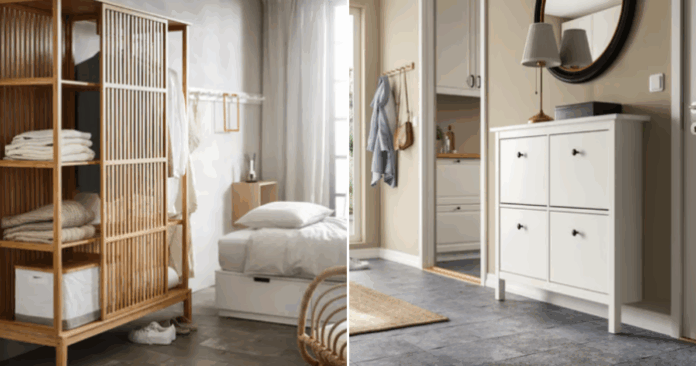 Think practical meets stylish, like the HEMNES shoe cabinet to keep entrances clutter-free, or the NORDKISA open wardrobe with sliding door, perfect for breathable, easy storage with a natural bamboo finish.