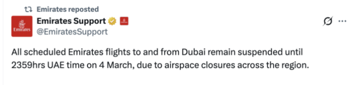 Emirates confirmed that all scheduled flights to and from Dubai remain suspended until 11:59pm UAE time on March 4 due to regional airspace closures.
